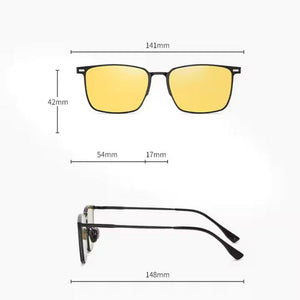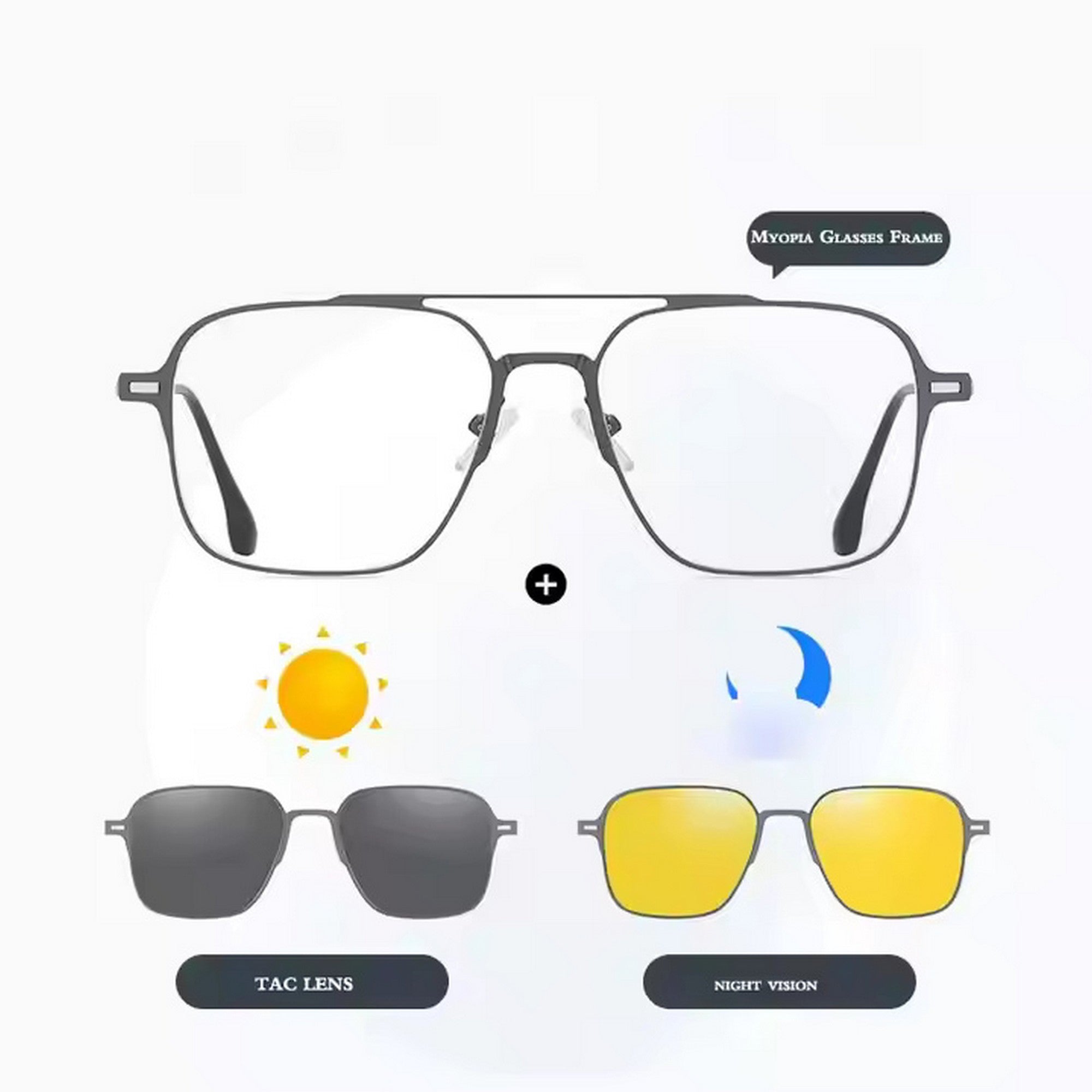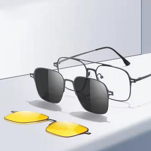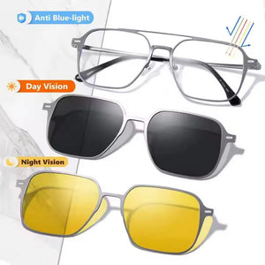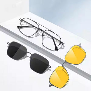 The Dervin 3-in-1 Magnetic Clip-on Glasses are the perfect all-in-one eyewear solution for men and women. Designed for versatility, these glasses come with three interchangeable magnetic lenses that cater to different needs: UV-protected polarized sunglasses, anti-glare blue light blocking computer glasses, and yellow-tinted driving glasses.